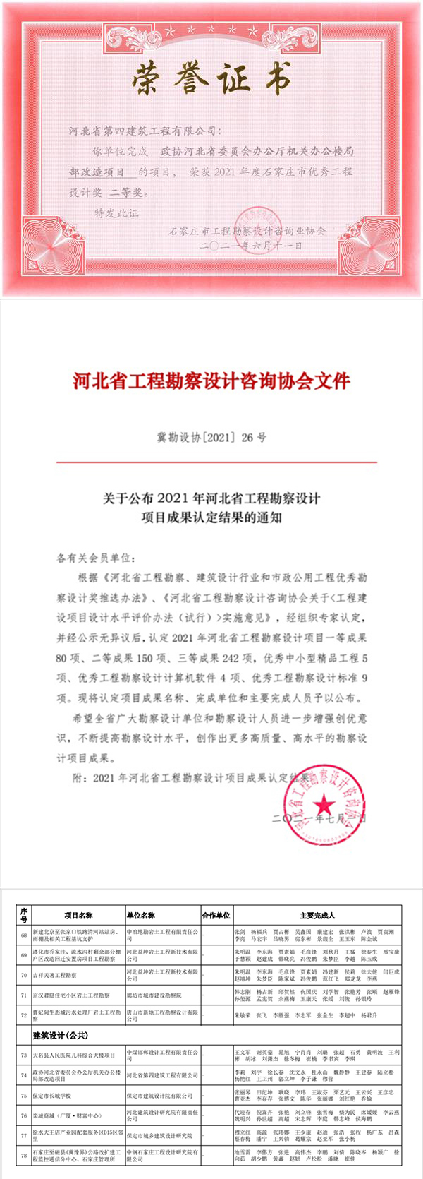 7月5日,公司河北四建收到荣誉证书和文件,《政协河北省委员会办公厅机关办公楼局部改造项目》获2021年石家庄市优秀工程设计奖二等奖、河北省工程勘察设计项目成果奖三等奖。